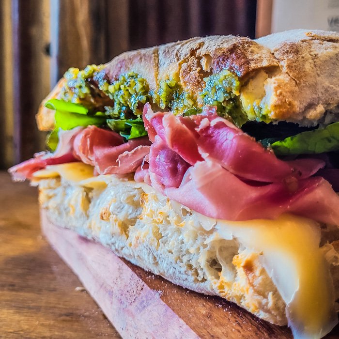 Presunto Parma, folhas de rúcula, pesto de manjericão e nozes, mel, queijo muçarela e a pasta de Dio, em pão Ciabatta de longa fermentação.